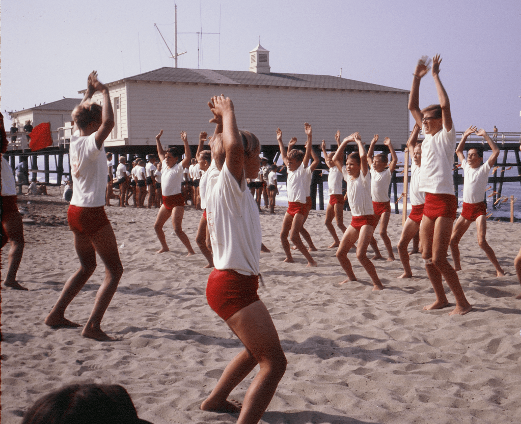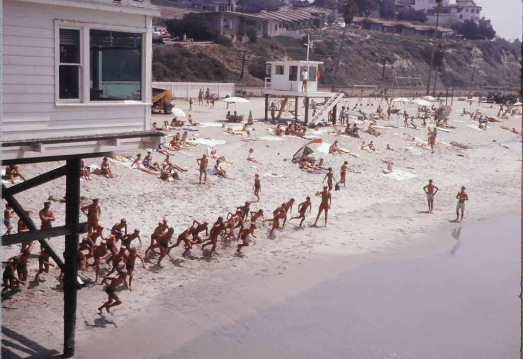 In the final week tests are given on all major subjects including a swim to the end of the pier and back. And to top off the course the group goes to Huntington Beach where they compete with a similar group being developed there.(Bank)