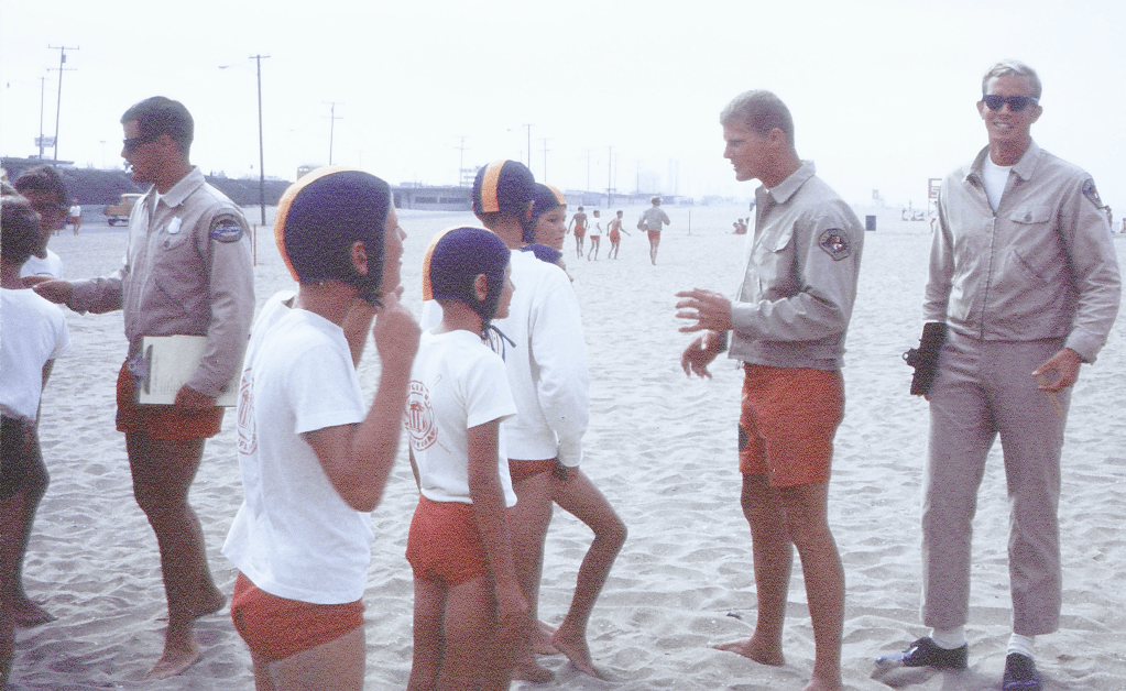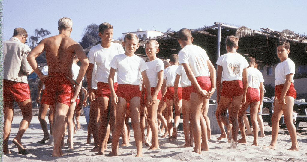 I remember we were required to wear red bun huggers with our red silk-screened JG shirts tucked in as our official uniform. We were also required to have our Junior Lifeguard patch sewn onto the front of our bun huggers. It was quite a look. We were all told to bring a blank white T-shirt in and they silk-screened the red Junior Guard logo on the back of the shirt in the garage at Lifeguard headquarters. (Wilson).